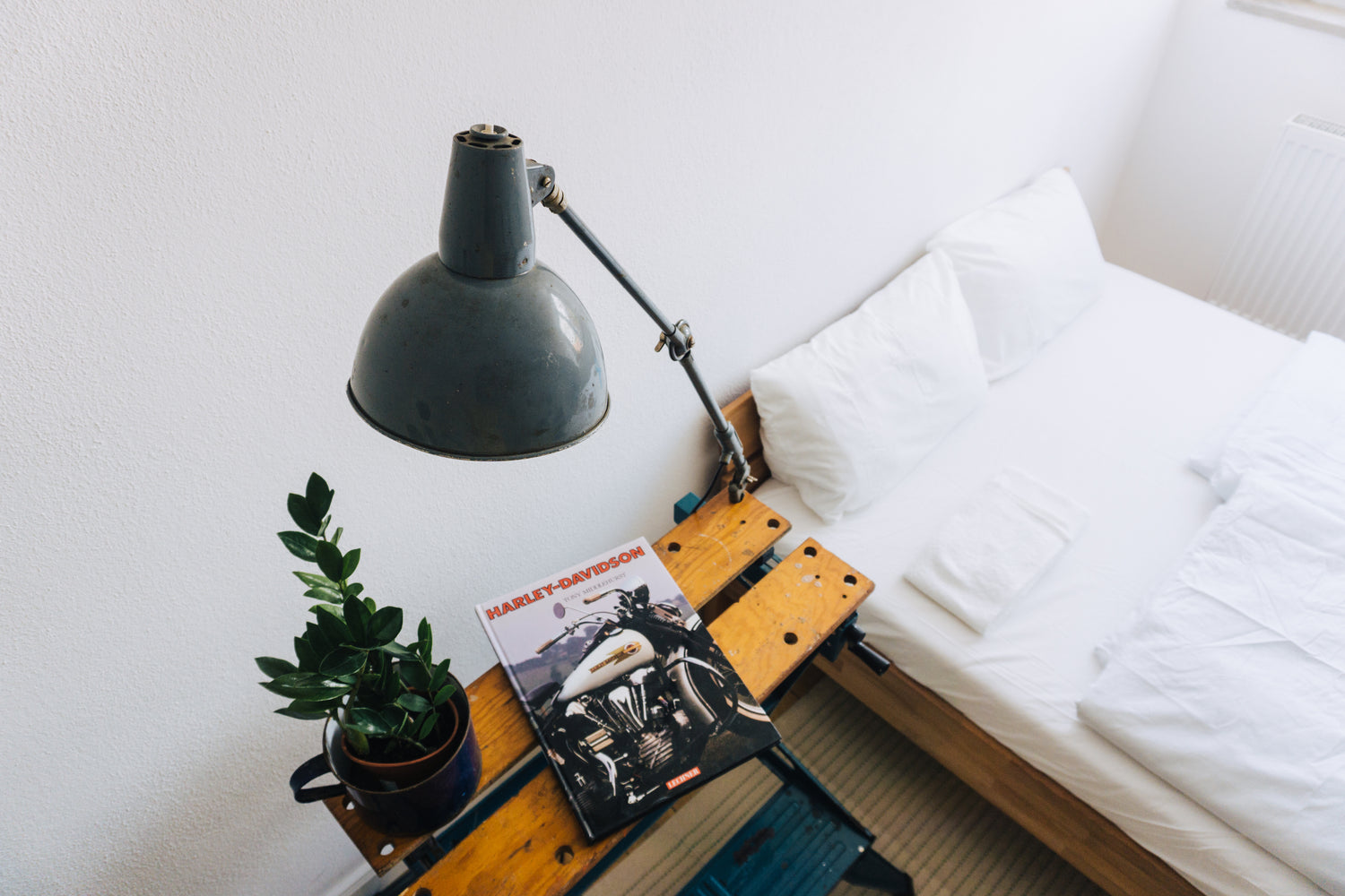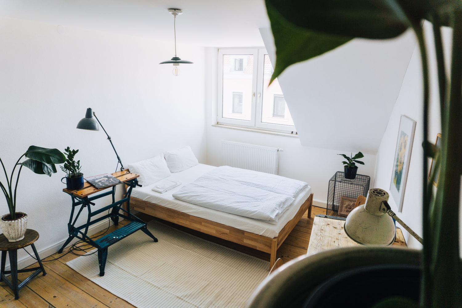 Ein einzigartiges Zimmer mit alten Holzdielen in einer behutsam restaurierten Wohnung in Regensburg. Die Einrichtung wurde mit liebe zum Detail ausgewählt und zum Teil selbst durch Upcycling erbaut. Die verschiedene Lichter laden zum Lesen und Verweilen ein.
