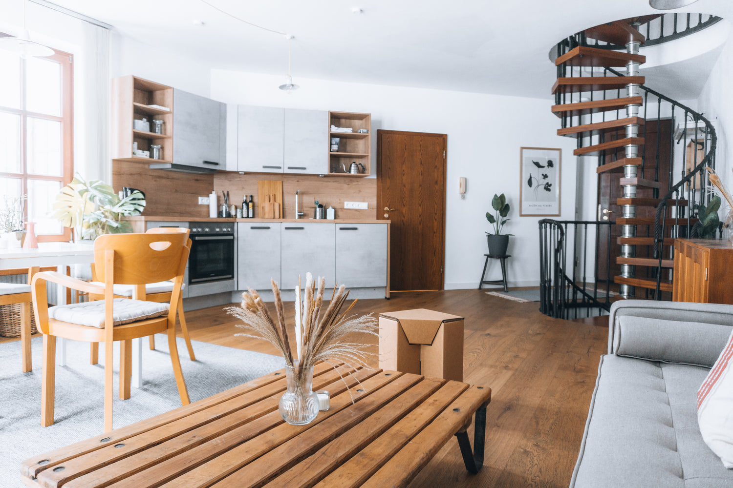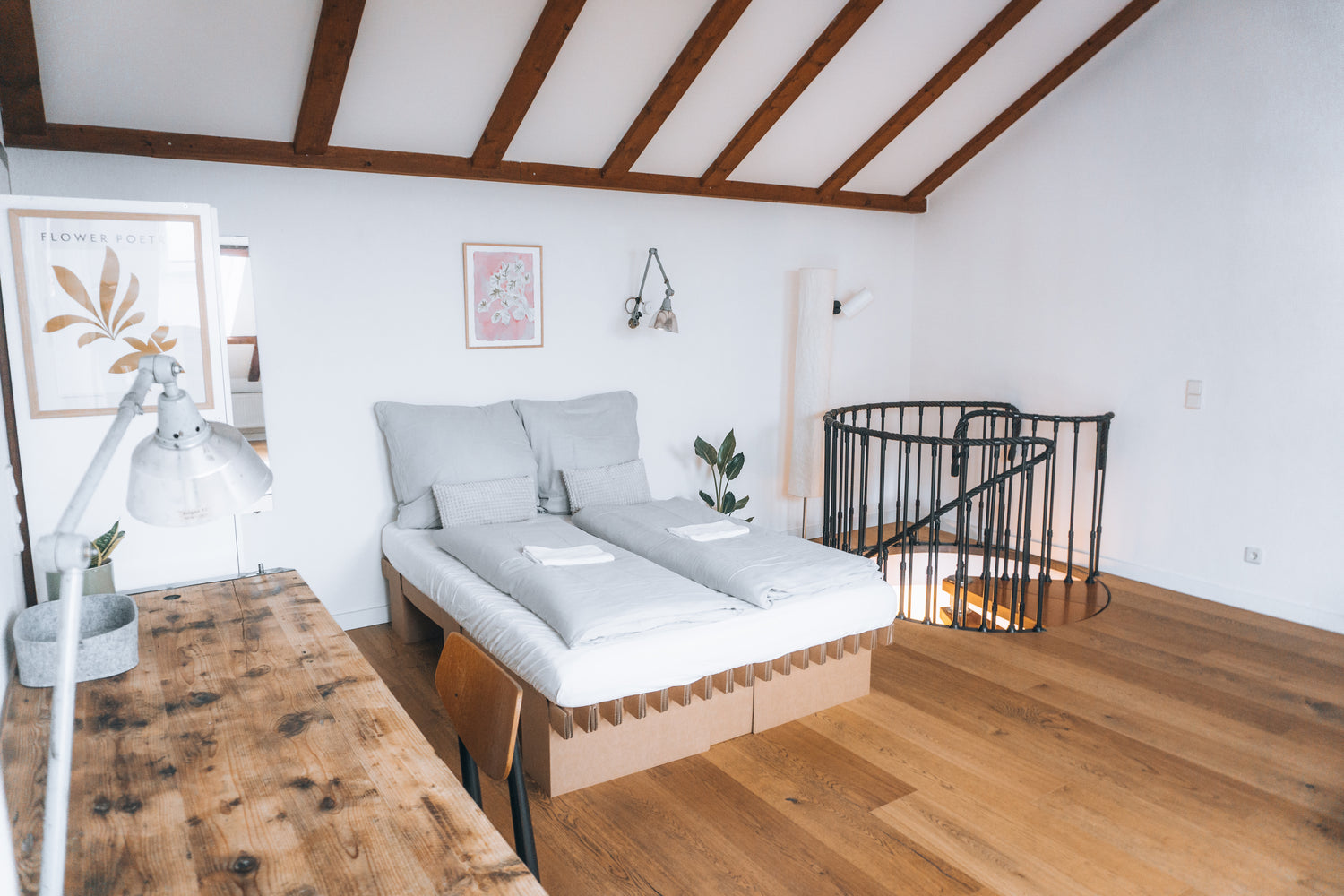 Diese stilvolle Unterkunft ist etwas ganz besonderes. Die Wohnung erstreckt sich über zwei Ebenen, die mit einer Wendeltreppe verbunden sind. Die Räume sind großzügig und eignet sich daher auch perfekt für Gruppenreisen. Im oberen Bereich befinden sich zwei Doppelbetten. Im offenen Wohnbereich ist viel Platz für gemeinschaftliches Kochen, Spieleabend oder entspanntem zusammensitzen. Die Schlafcouch bietet optional einen zusätzlich Platz zum übernachten.