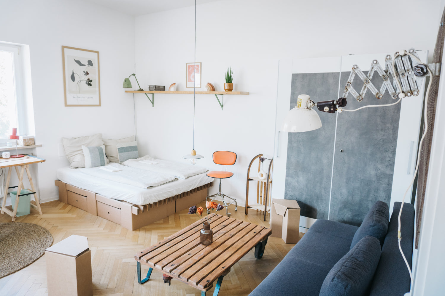 Die Einrichtung der Wohnung gestaltet sich größtenteils aus nachhaltigen Möbelstücken. Von upcycling Projekten bis zu Möbel aus Pappkarton ist alles dabei!