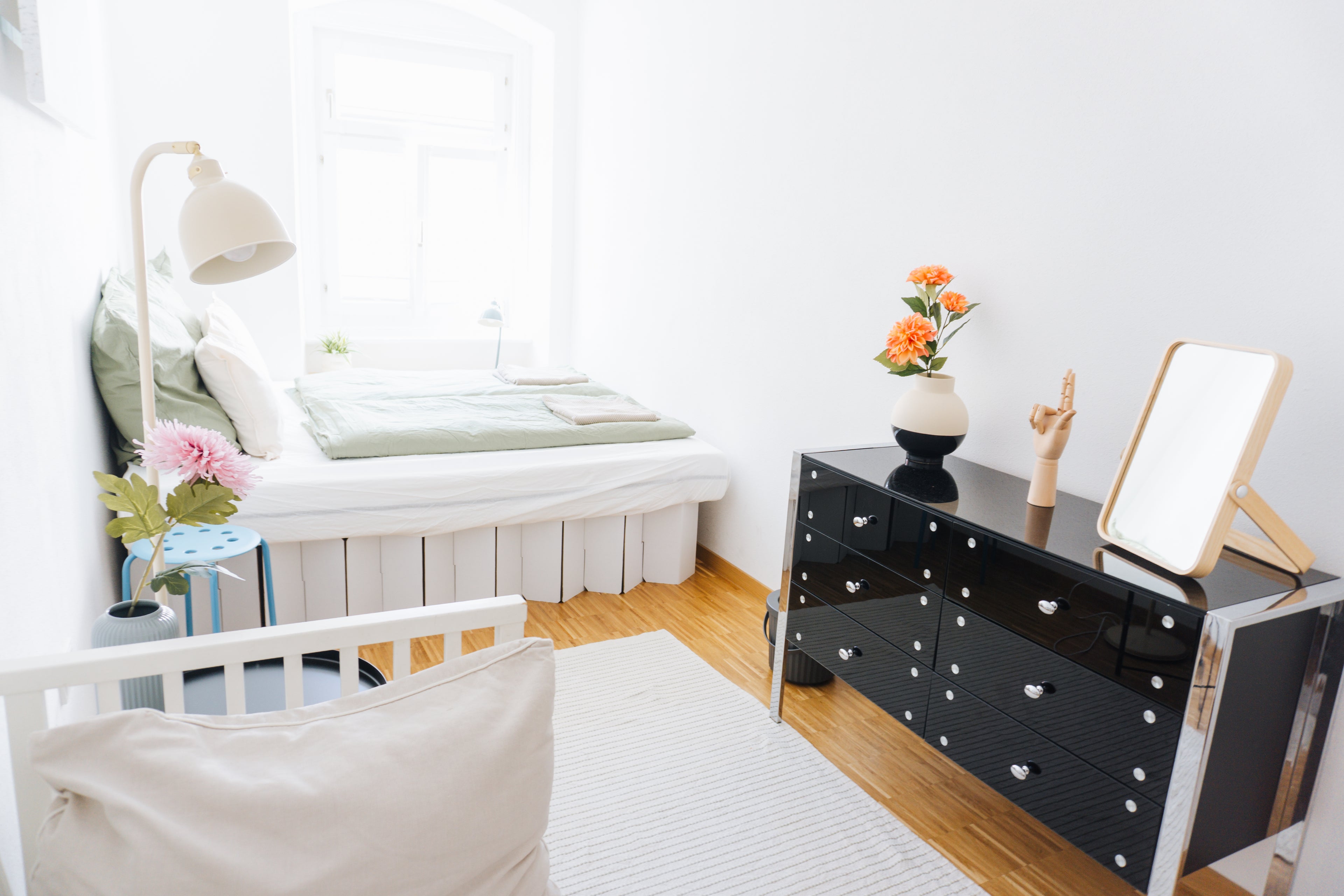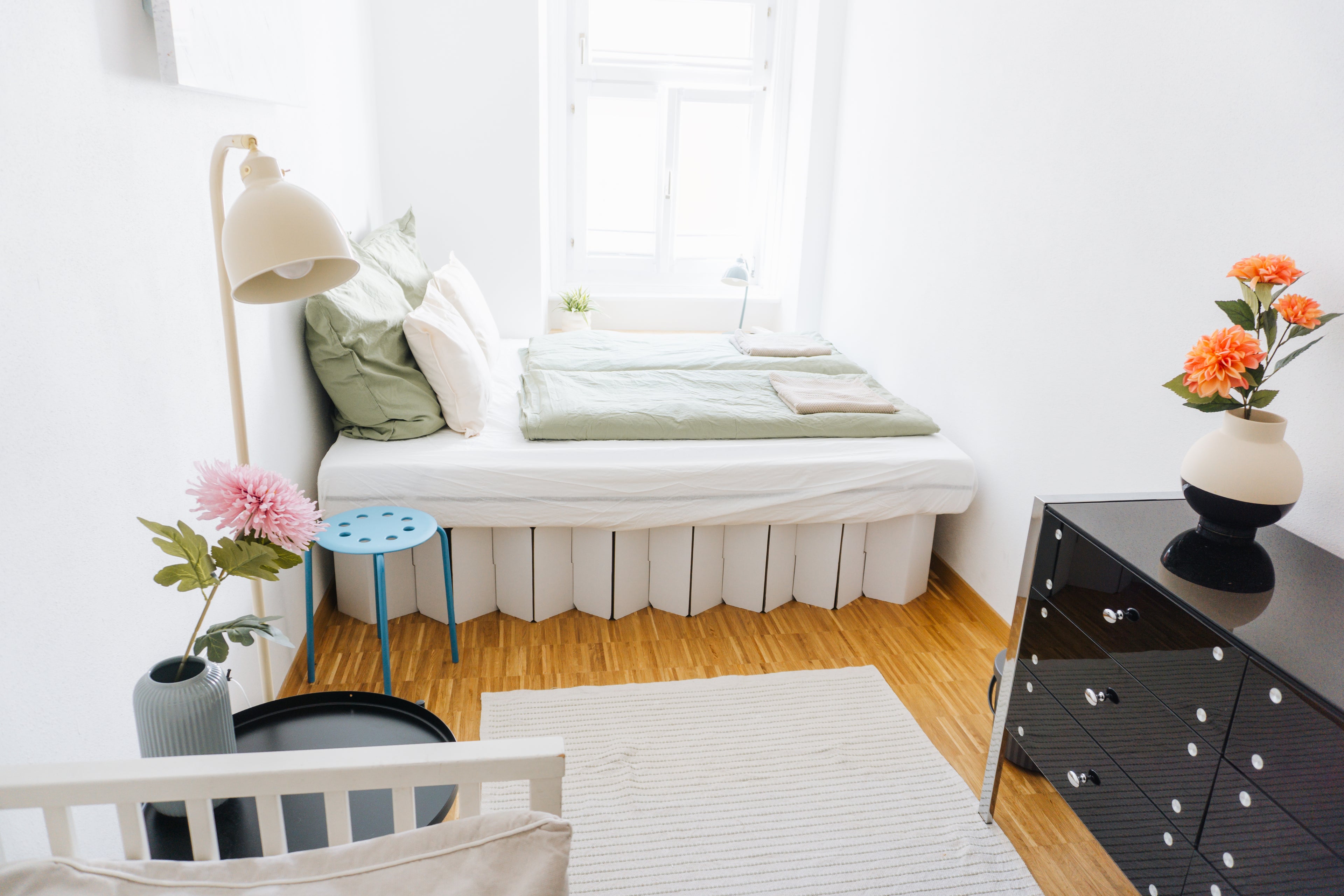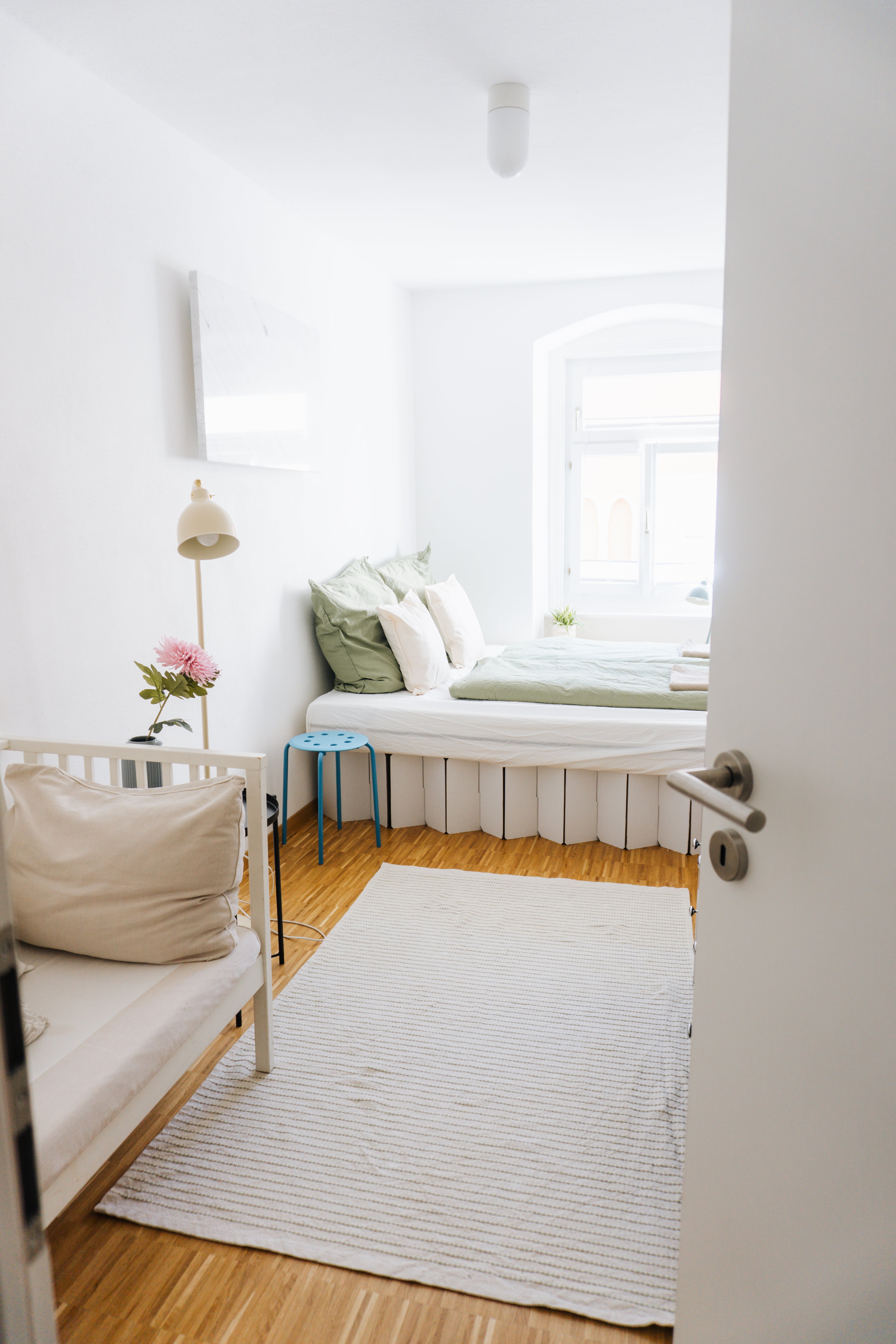 Die Einrichtung der Wohnung gestaltet sich größtenteils aus nachhaltigen Möbelstücken. Von upcycling Projekten bis zu Möbel aus Pappkarton ist alles dabei!