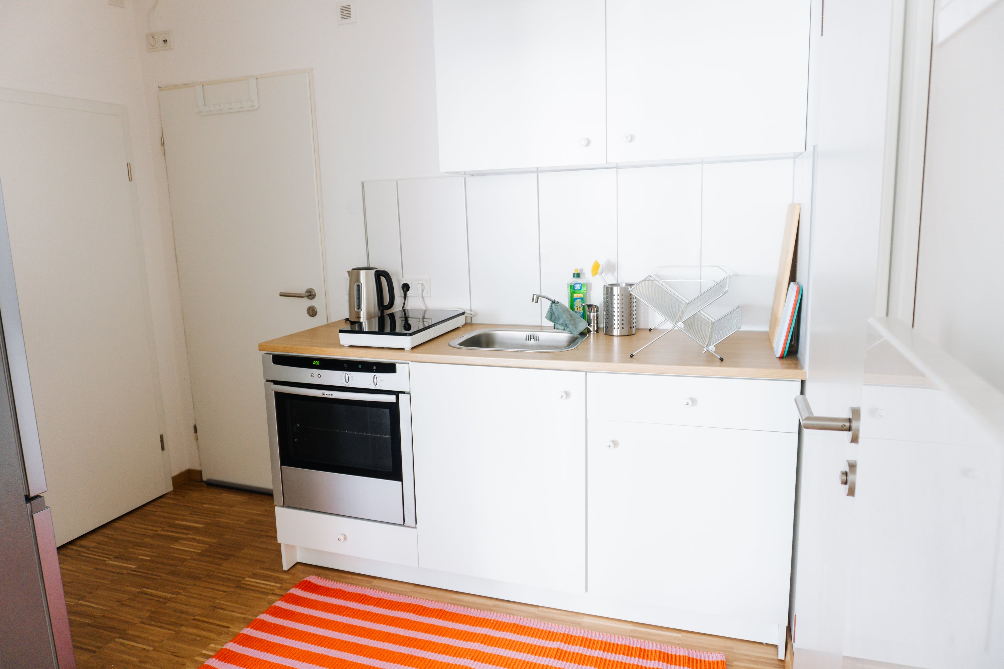 In der Wohnung an sich befindet sich eine kleine, vollausgestattete Küche. Auch gibt es eine breite Grundausstattung an Lebensmitteln (Öle, Salz, Pfeffer und so weiter). Du bist herzlich eingeladen, die Küche zu nutzen und dir ein leckeres Gericht zu kochen. Natürlich kannst du auch den Kühlschrank und das Gefrierfach benutzen.