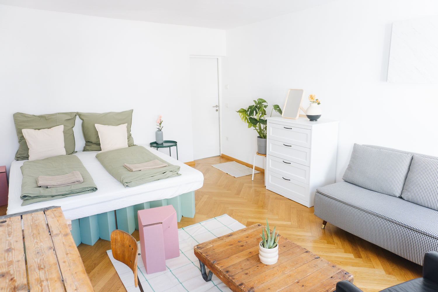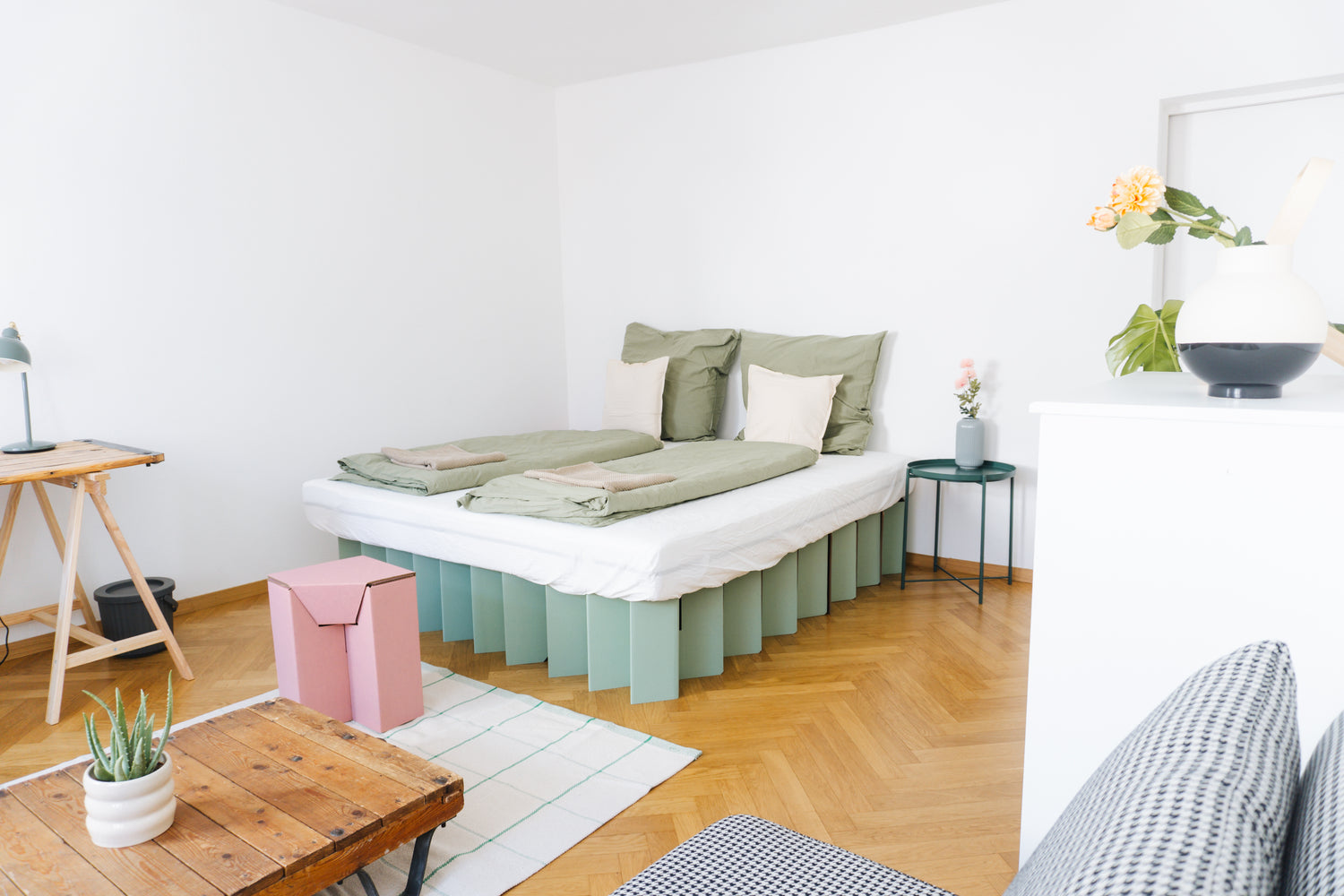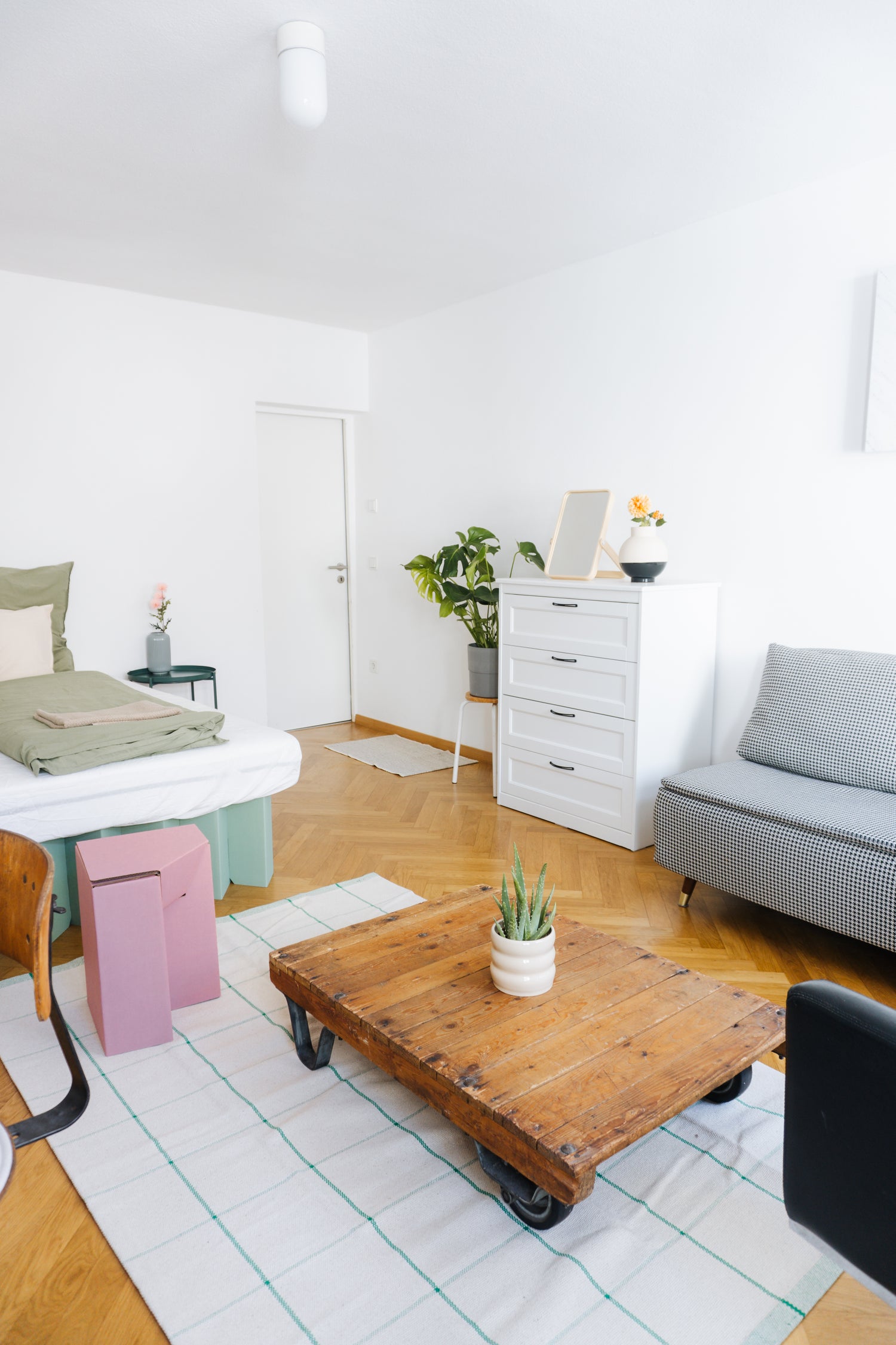 Die Einrichtung der Wohnung gestaltet sich größtenteils aus nachhaltigen Möbelstücken. Von upcycling Projekten bis zu Möbel aus Pappkarton ist alles dabei!