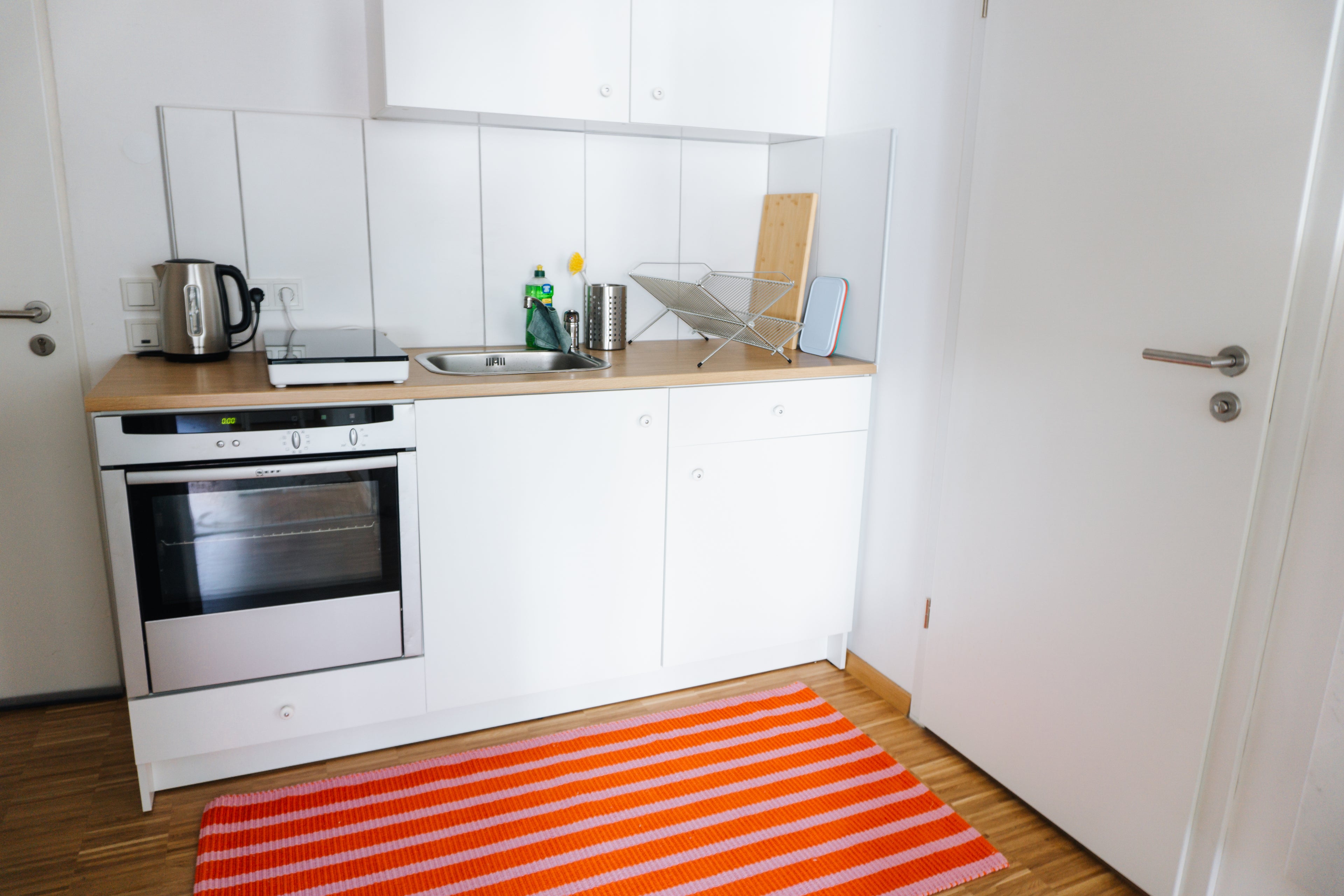 In der Wohnung an sich befindet sich eine kleine, vollausgestattete Küche. Auch gibt es eine breite Grundausstattung an Lebensmitteln (Öle, Salz, Pfeffer und so weiter). Du bist herzlich eingeladen, die Küche zu nutzen und dir ein leckeres Gericht zu kochen. Natürlich kannst du auch den Kühlschrank und das Gefrierfach benutzen.