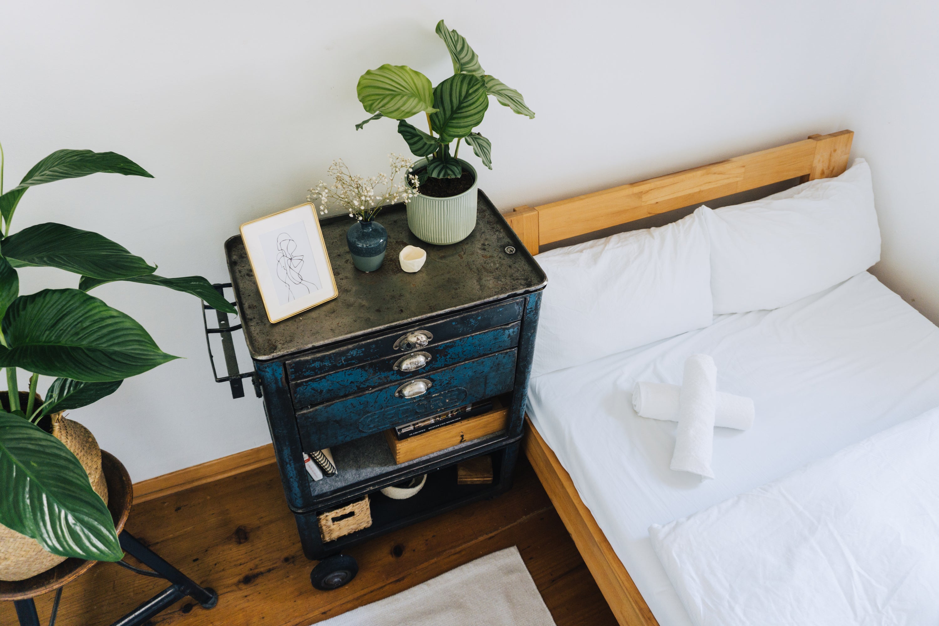 Ein wunderschönes Zimmer mit alten Holzdielen in einer behutsam restaurierten Fachwerkwohnung im Herzen von Regensburg. Die Einrichtung wurde mit liebe zum Detail ausgewählt und zum Teil selbst durch Upcycling erbaut. Die verschiedene Lichter laden zum Lesen und Verweilen ein.